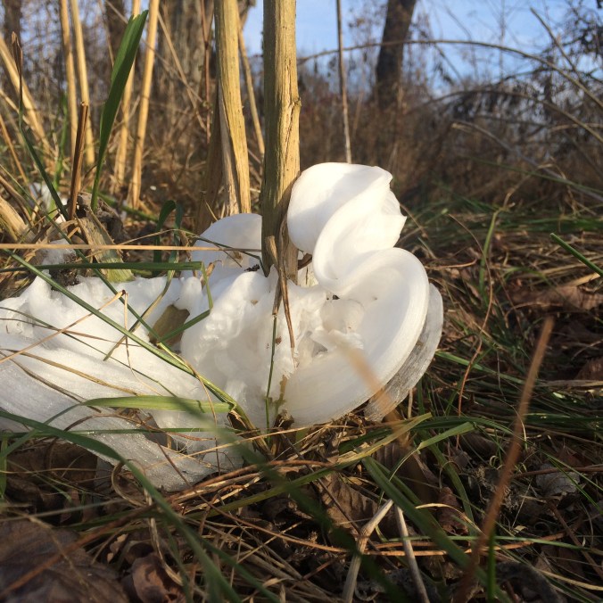 It’s kind of a miraculous sight–easy to miss. If we didn’t walk by those particular flowers at that certain hour on that certain day, we would never see the icy display. And as soon as it comes it is gone. Like with the ephemeral trilliums that fill our woods in the spring, we must seize the day…carpe the big fat diem, as I might say…in order to behold this bouquet of icy petals.