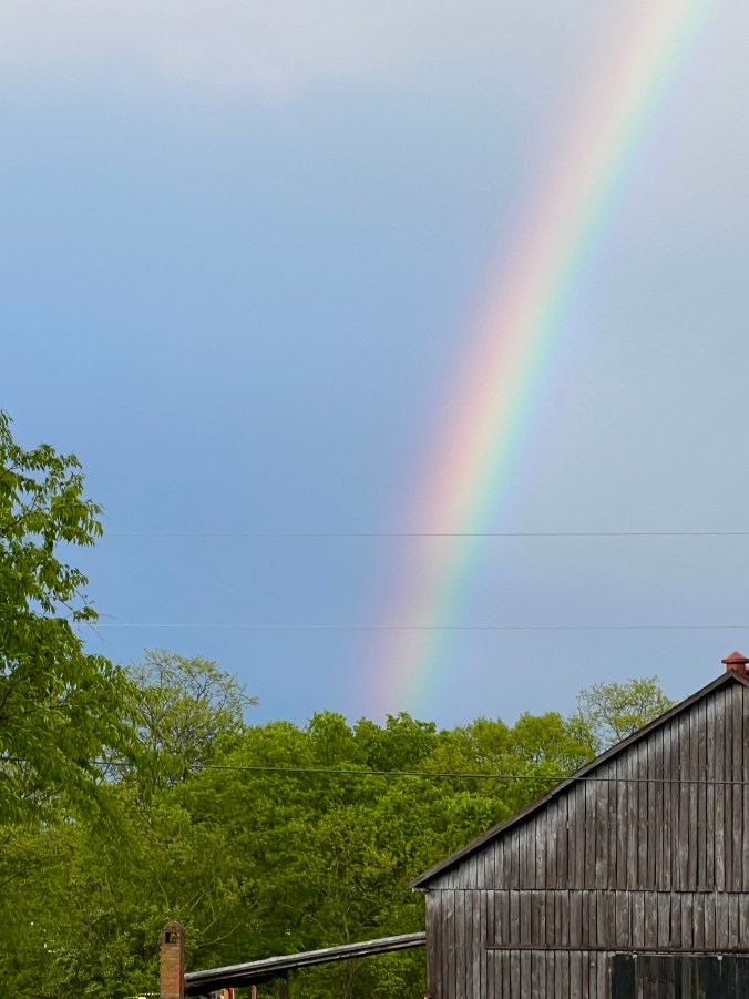 Yesterday’s rainbow from the front porch of our Jessamine farm: The right words, aptly arranged, can turn sun and rain into a rainbow.