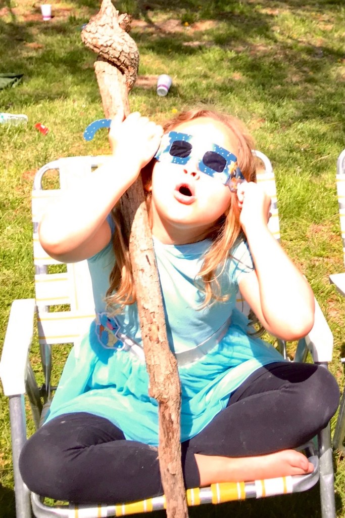 I watched my 5 year old grandson, Julian, dancing around in celebratory circles, pausing occasionally to put on his special glasses to announce the phases of the disappearing sun: “I can see the moon.” ” It’s just a fingernail!” “It’s a sliver!” “The bees are going back to their beehive.” And during totality, “I can see two stars.” “I actually can see a red “o” on the moon,” he declared when a solar prominence, a burst of plasma, became visible from the bottom of the sun’s corona.