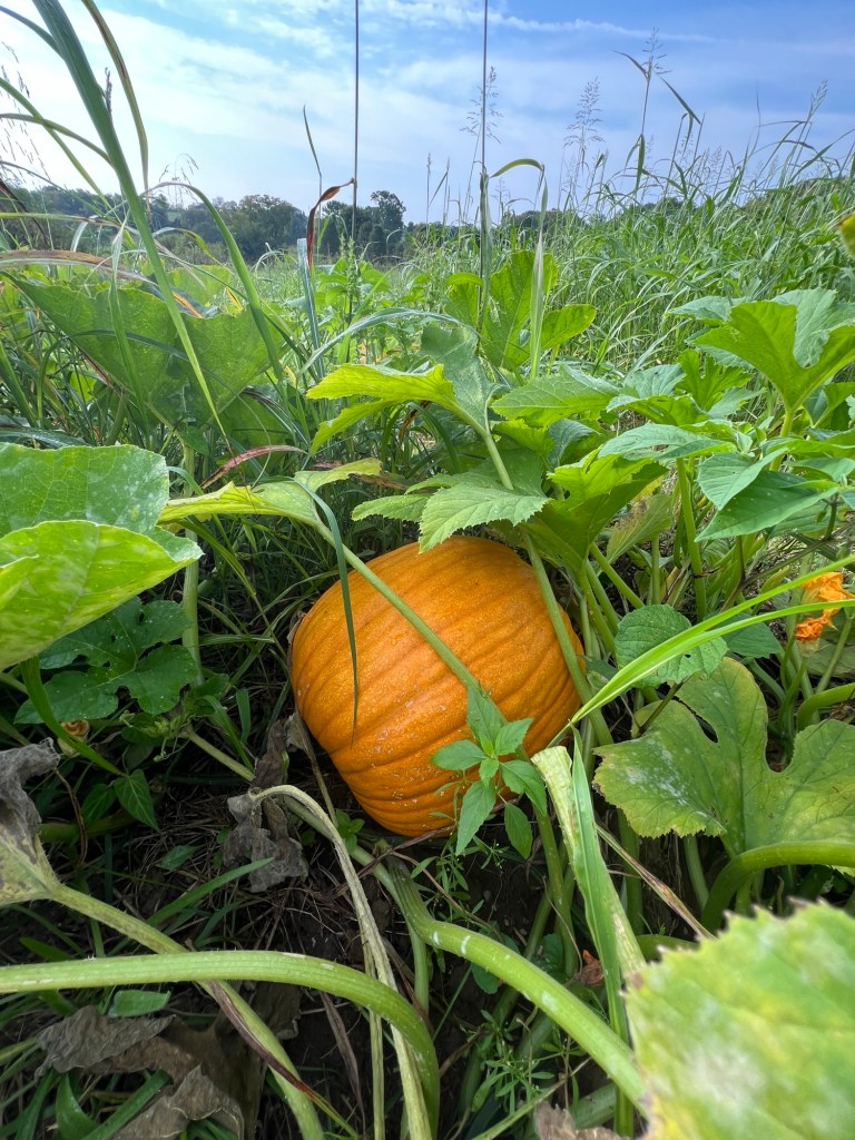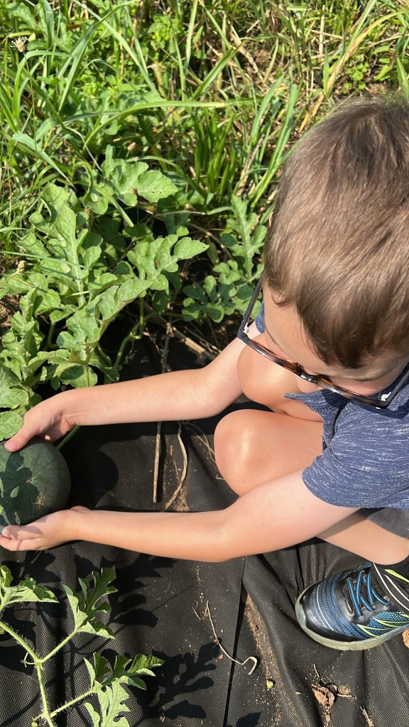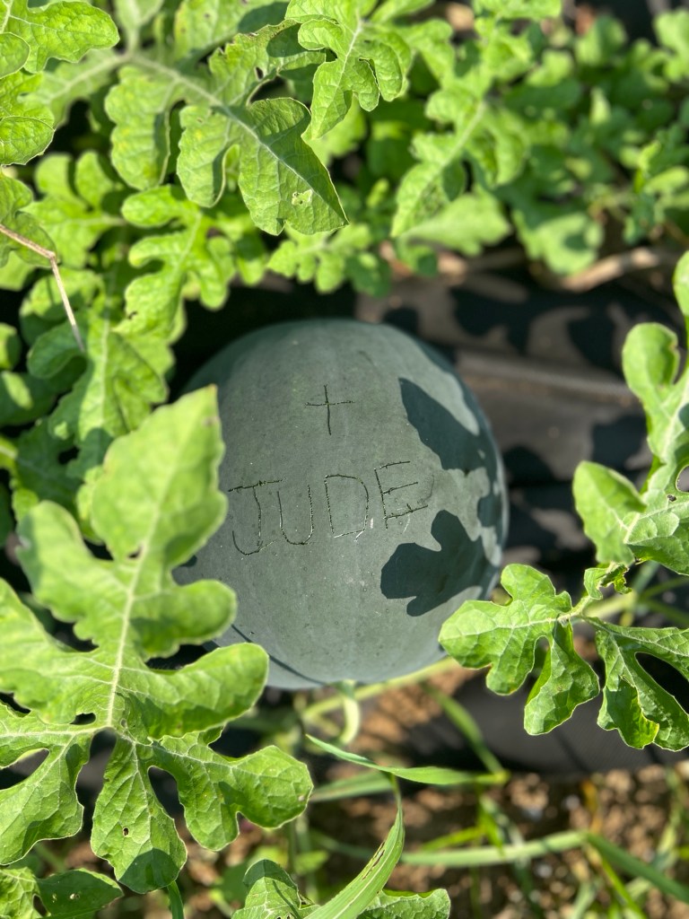 But, eventually, and through many hours of Hule’s tending and weeding and laying out landscape cloth, the okra emerged in a nice straight line. Little baby watermelons came out—some too cute not to be picked and pocketed by our grandson. Even pumpkins grew! That has been fun watching the pumpkin vines stretch out into the pasture as they make more and more small orange globes.