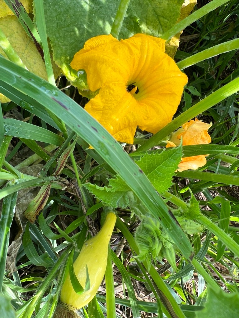 But, by far the star of the show has been our summer squash. Unbeknownst to us, all 3 of the planters had taken on the task of planting hills of squash. So—we have been inundated with it. I’ve made fried squash, boiled squash, stir fry squash, and squash casserole. We’ve brought bags of squash to our daughter in Lexington and to our neighbor. And, for those “big’uns” (as my grandparents might have said) we created a new compost pile—a pile of crooked neck gold out in the field that, we hope, will eventually become soil again. Some of the squash went to our 3 chickens, but they are particular and slow to eat it. If there is any hope of fruit or worms, they turn their beaks up and snub the squash.